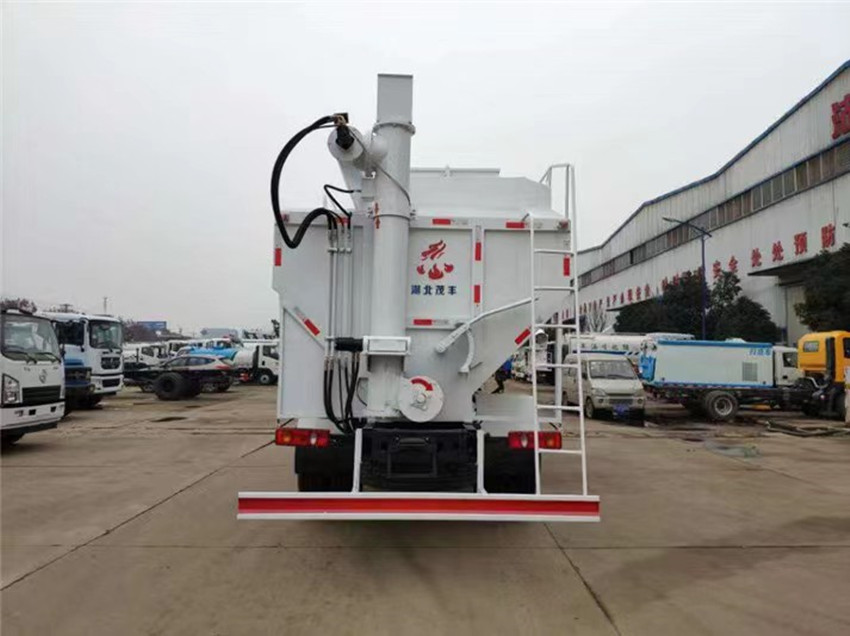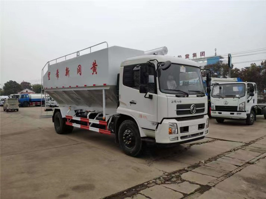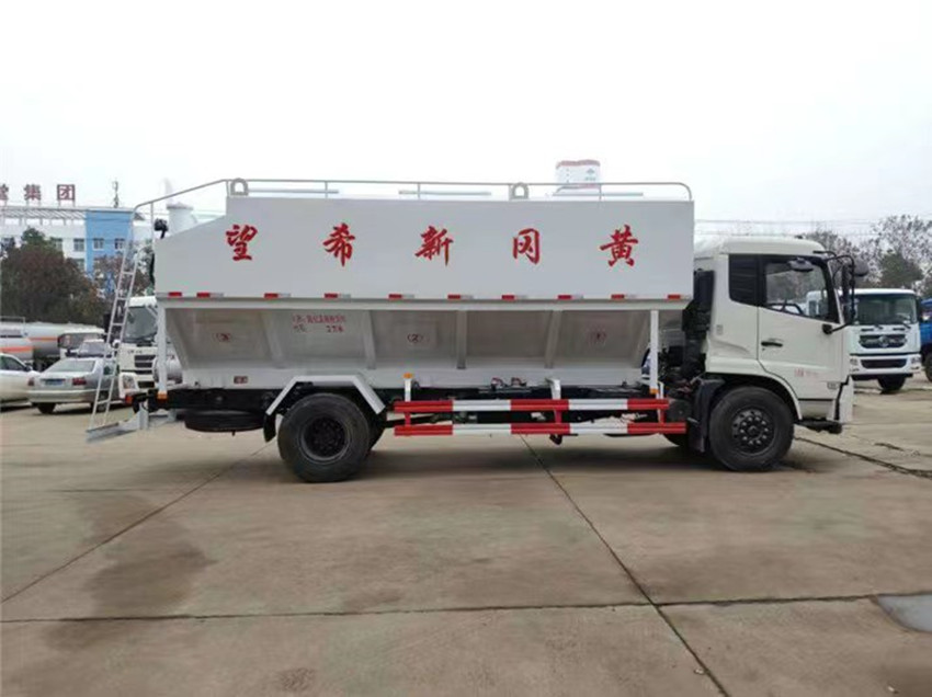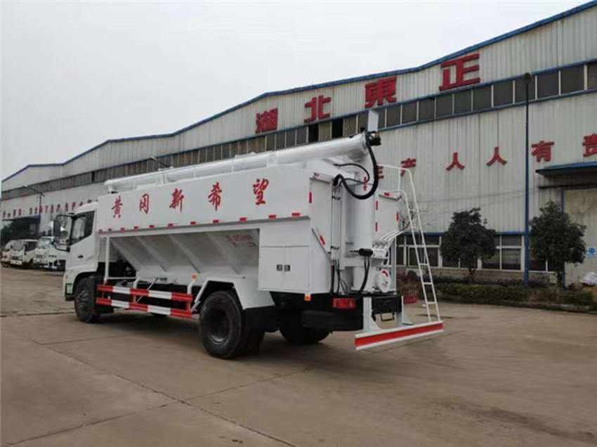 散裝飼料運輸車,散裝飼料車的飼料罐架設在卡車的底盤上,罐頂開有進料口.頂部的一根螺旋輸送卸料管(俗稱卸料絞龍)則可自由回轉和抬升,抬升的仰角可達60度。運輸時,頂部的螺旋管平臥在罐頂;卸料時則抬起,使管端的出料口與畜禽飼養(yǎng)場貯料罐頂部的進料門相接,駕駛室內(nèi)裝有操縱裝置(操縱裝置也可裝置在罐體尾部),卸料時通過車底的動力輸出軸和減速器來驅(qū)動螺旋,以完成卸料。